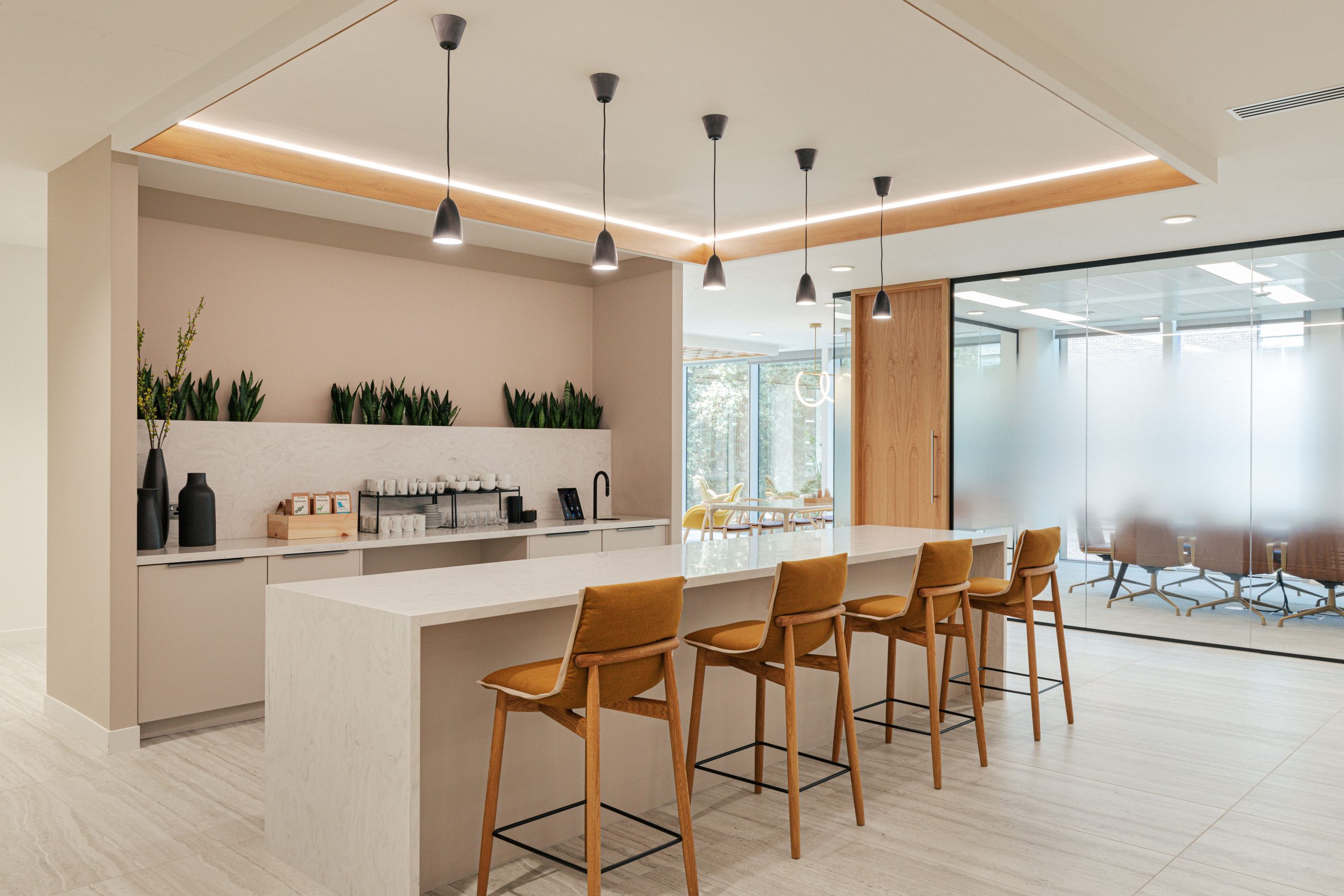 A light-filled, versatile office design that blends sleek, modern aesthetics with biophilic elements, creating a balanced environment for collaboration, relaxation, and focused work.