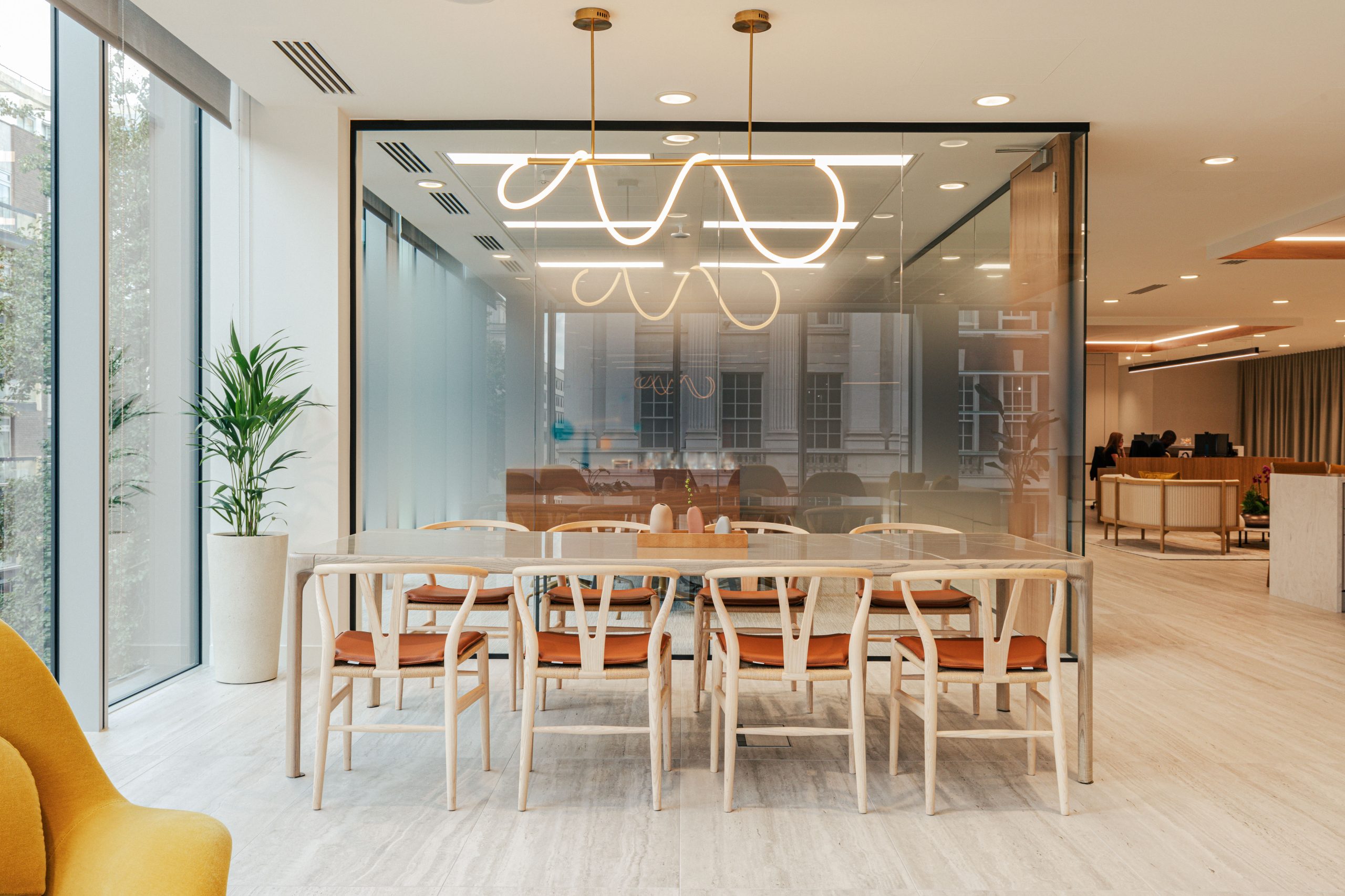 Our design focused on light, openness, and versatility. Located in a bustling central London setting, we maximised natural light through large glass windows and walls, creating an airy, open feel throughout the office.